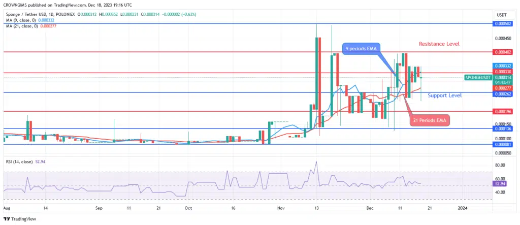 SPONGEUSDT is the ideal option for shorter periods. The price trend reversed course on December 07 and achieved the $0.000403 resistance level after reaching the $0.000262 support level. The price increased as a result of buyers’ momentum when more clients were attracted. The price of the coin rises towards the $0.000403 level as more investors buy it due to the $0.000196 support level.