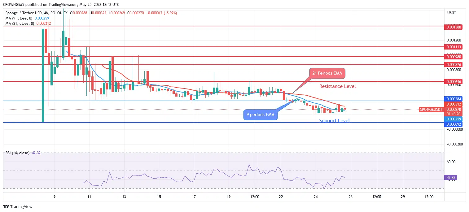 Sponge may rise above $0.00087 if the bulls apply further pressure. Bullish momentum will accelerate as soon as the price breaks through the $0.00038 resistance level, which is followed by the $0.00065 and $0.00087 barrier levels.