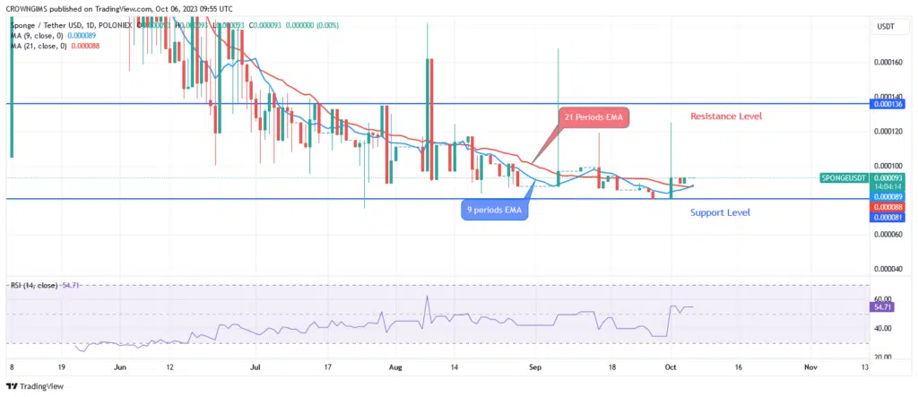 SPONGEUSDTUSD predicts a bullish short-term trend. The Bulls continue to advance on the 4-hour chart. An increase in the bulls’ momentum led to the previous 9-period and 21-period EMA dynamic resistance levels being broken. The cryptocurrency is currently heading in the direction of the resistance level of $0.000136.