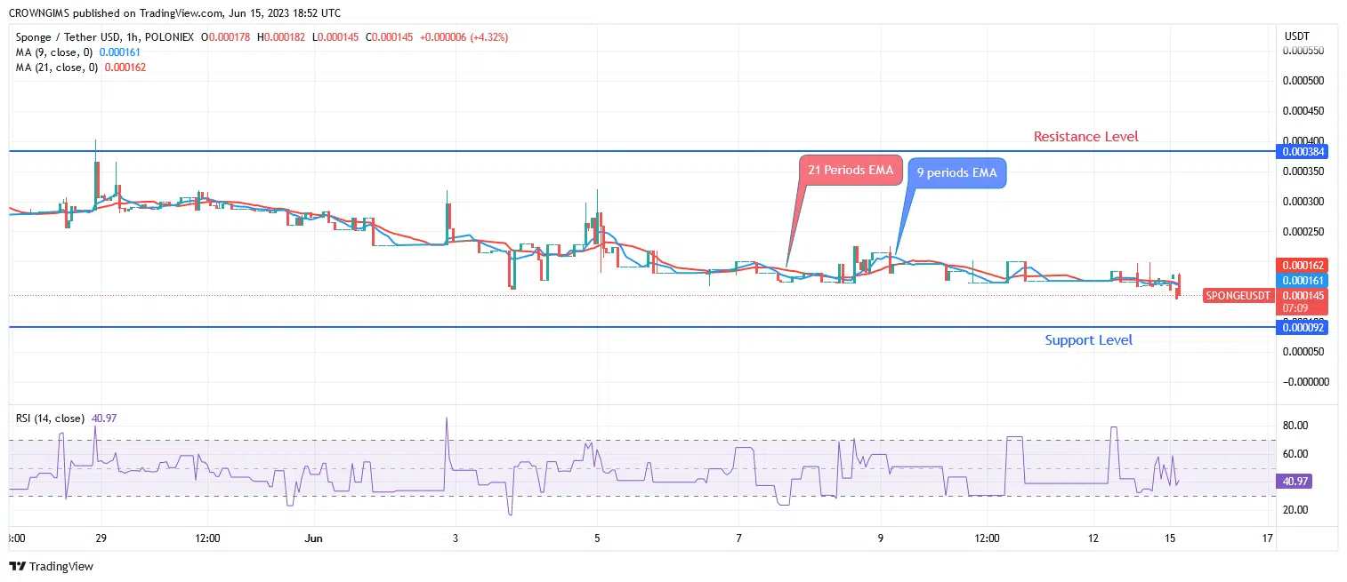 On the daily chart, SPONGEUSDT is bullish. The price of the coin right now is $0.00038. Prices vary from $0.00038 to $0.00092 to provide investors with more options and to allow a wide number of individuals to buy sponge. It would be advantageous for all investors to ride the rising trend, which will soon start to affect the SPONGEUSDT market. If there is a bullish breakout at the $0.00038 level, the present high resistance levels will swiftly turn into low resistance levels.