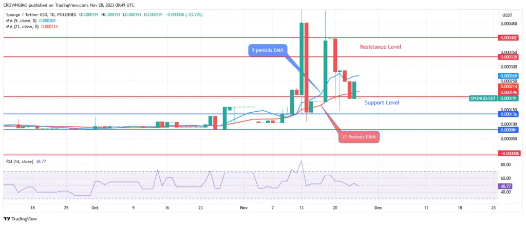 Should the bulls’ pressure continue to build, Sponge may break through the $0.000330 resistance level and go up to the $0.000402 and $0.000502 price levels. The price may drop into the support levels at $0.000196, $0.000269, and $0.000136 if the resistance level at $0.000330 persists.