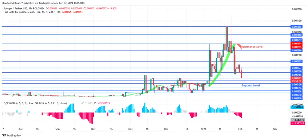 The SPONGEUSDT 4-hour chart is climbing. The 4-hour chart’s price movement has produced a double top pattern near the $0.001298 resistance level. Following the initial fall at $0.000886, the price fell. To retest the broken level, the price pulled back. In an attempt to breach the support level at $0.000404, the price fell following the second loss at $0.000695. Right now, the price is making an effort to break down the $0.000404 mark.