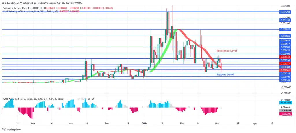 The close proximity of the price above the Hull Suite Crypto signal suggests that the momentum of the bulls is increasing. Additionally, there’s a possibility that the QQE MOD Crypto signals will increase above zero. After the price pullback, a further gain in the SPONGEUSDT price is anticipated, assuming the currency breaks above the resistance level of $0.000301. The levels at $0.000328 and $0.000356 will be the next growth targets. Price can drop to the support levels of $0.000248, $0.000190, and $0.000143 if the bears continue to hold the resistance level at $0.000301.