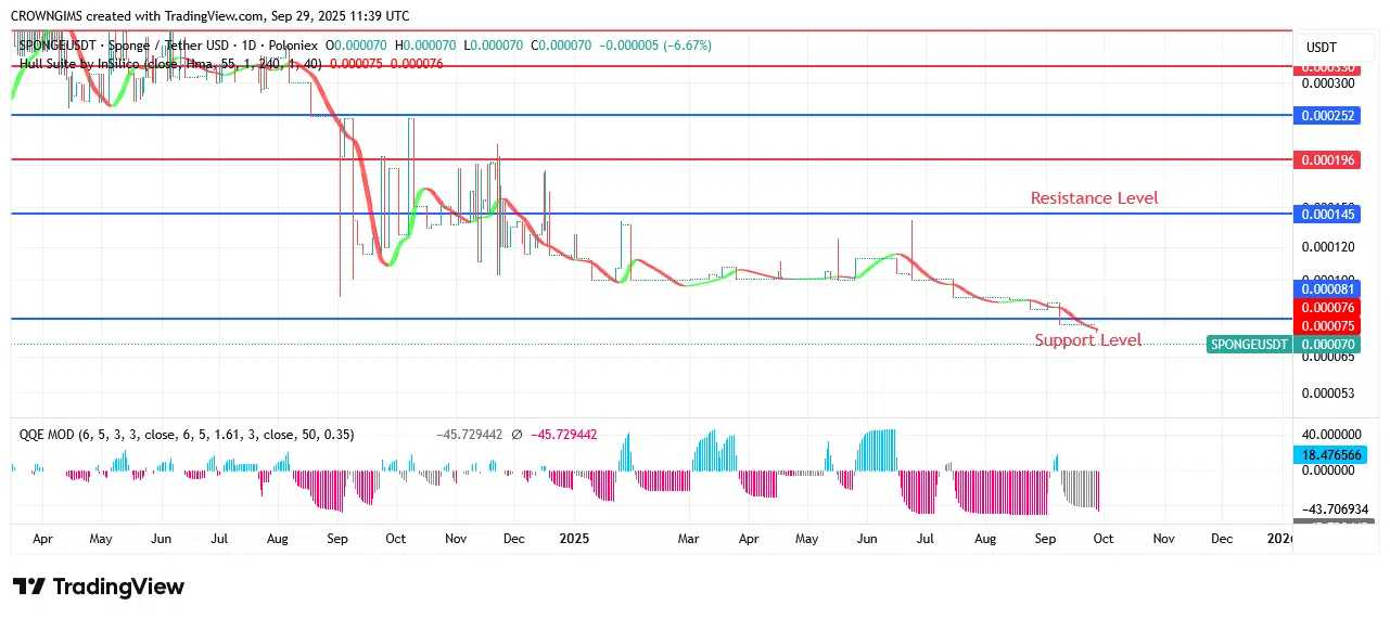 A bright future is indicated by the daily SPONGEUSDT chart. In order to expand the options accessible to investors, buyers granted sellers complete power over their actions. Sponge must also be available to a broad spectrum of individuals. Right now, the price is $0.000081 or less. Bravo, sponge producer. Investors will benefit from the upward trend that the SPONGEUSDT market will soon start to show. If there is a bullish breakout at the $0.000145 level, the current strong resistance levels will quickly turn into support levels.