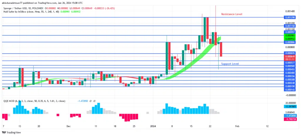 If the bulls can break above the resistance level at $0.000695, they might get as high as $0.000886 and $0.001298. If the resistance level of $0.000695 holds, Sponge may reverse and go back to the support levels of $0.000886, $0.000695, and $0.000577.