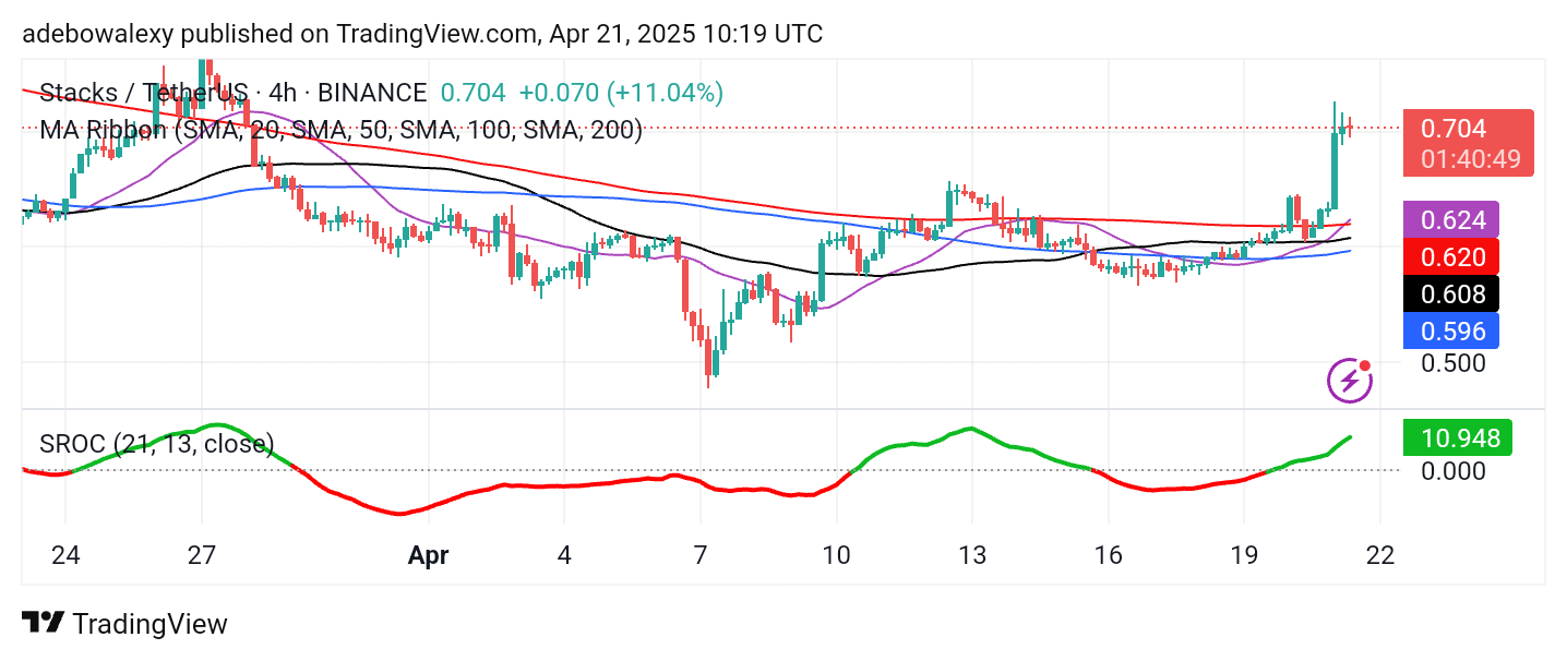 The STX/USDT 4-hour chart clearly shows that price action has overcome resistance posed by the MA lines. In addition, the token is now trading above the psychological $0.7000 level, further supporting the bullish outlook.