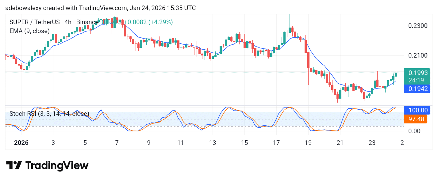 Price activity in the SuperVerse daily market has been edging higher since the previous session. However, as of the time of writing, the coin holds a price increase of 4.81%. Let’s take a closer look at the market below.
