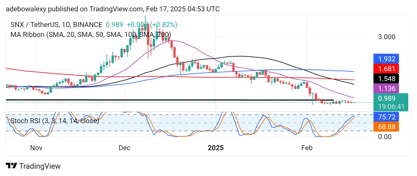 Moreover, price action remains below all the Moving Average (MA) lines, reinforcing a bearish outlook. The ongoing session has formed a dashed green price candle, signaling uncertainty in the market direction. Meanwhile, the Stochastic Relative Strength Index (RSI) lines are steadily rising into the overbought region, suggesting that SNX lacks strong buying traction and may struggle to reclaim its previous support level soon.