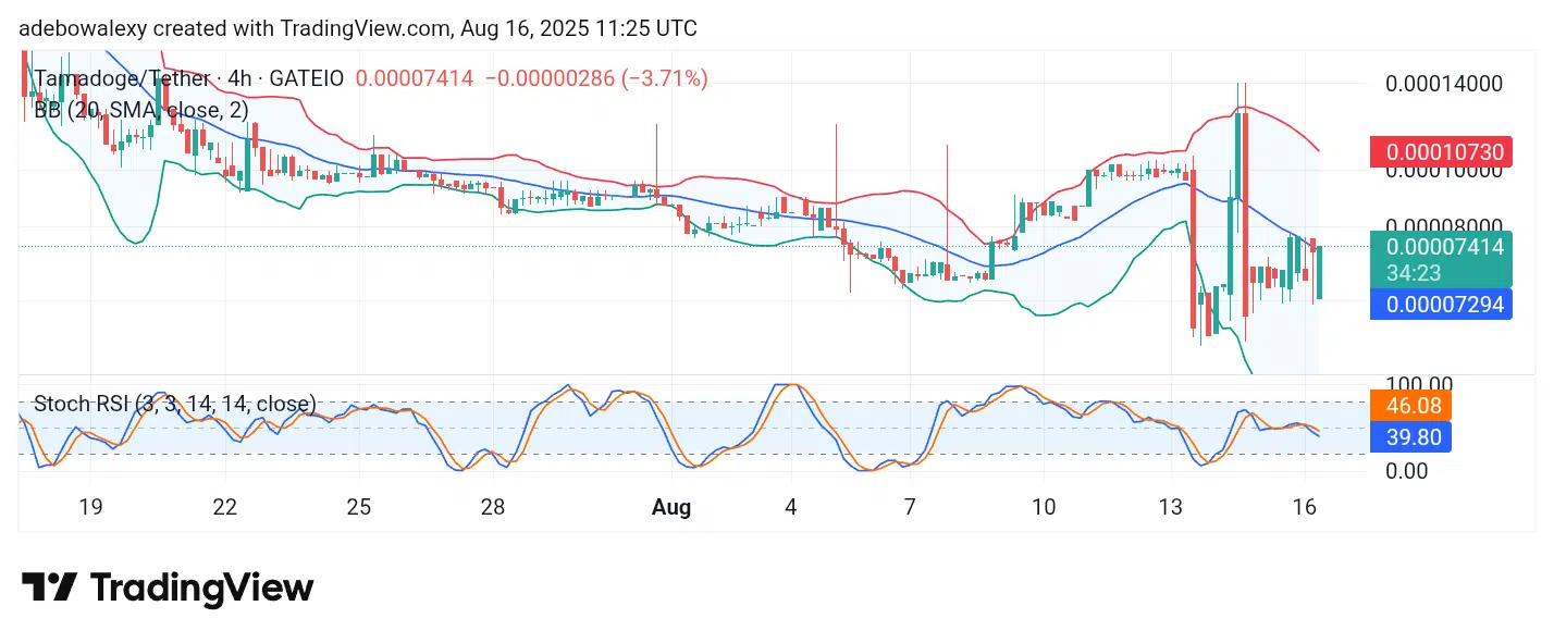 On the TAMA/USDT 4-hour chart, price action can be seen registering a strong upward correction within a single session. The market continues to display notable volatility. Currently, the token trades above the middle band of the Bollinger Bands (BB) indicator. Additionally, the BB indicator retains a healthy width, which leaves room for further upside development.