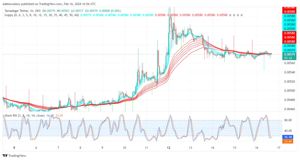 In a smaller Tamadoge market of 1 hour, it could be seen that price action maintains a favorable position. Although the current session has minimal downward correction below the GMMA indicator lines, it could be seen that price action stands at a considerable distance off the strong support at the $0.005680 mark.