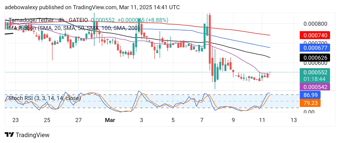 On the TAMA/USDT 4-hour chart, price action is steadily advancing upward. Notably, this upward movement persists despite the presence of recent bearish price candles. However, the latest price candle has turned green and has now appeared above the 20-day Moving Average (MA) line.