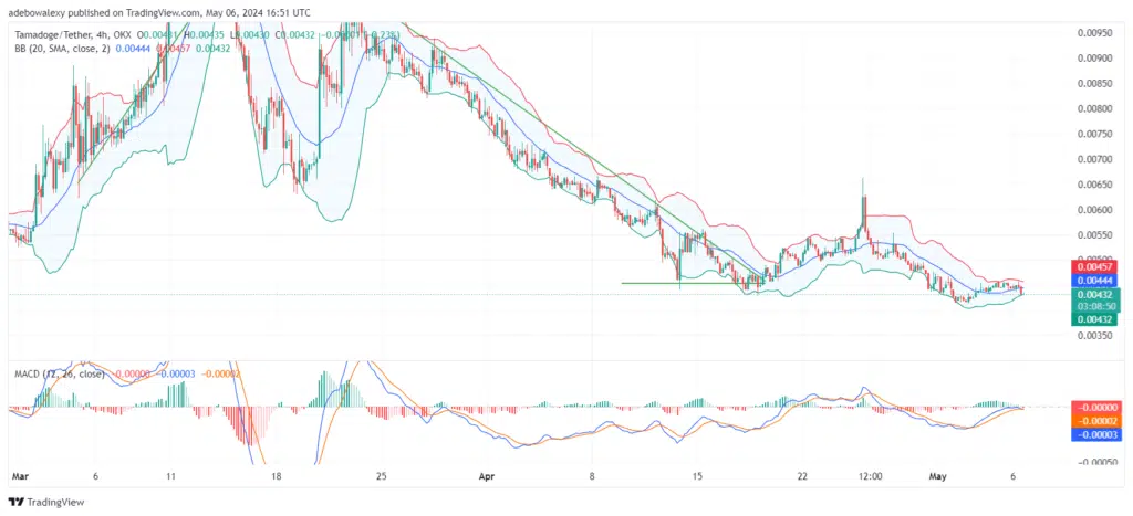 Price activity witnessed a moderate downward correction in the Tamadoge 4-hour market. Price action has touched down on the lowest limit of the Bollinger Bands. Likewise, the upper and lower limits of the Bollinger Bands appear to be contracting.