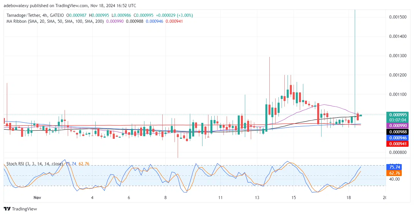 The TAMA/USDT hourly market suggests that price action is gaining upward momentum. The latest price candle on the hourly chart is green, similar to the 4-hour chart. Moreover, the price is now trading just above the 200-day MA line, which is positioned above the 20-day and 50-day MA lines.