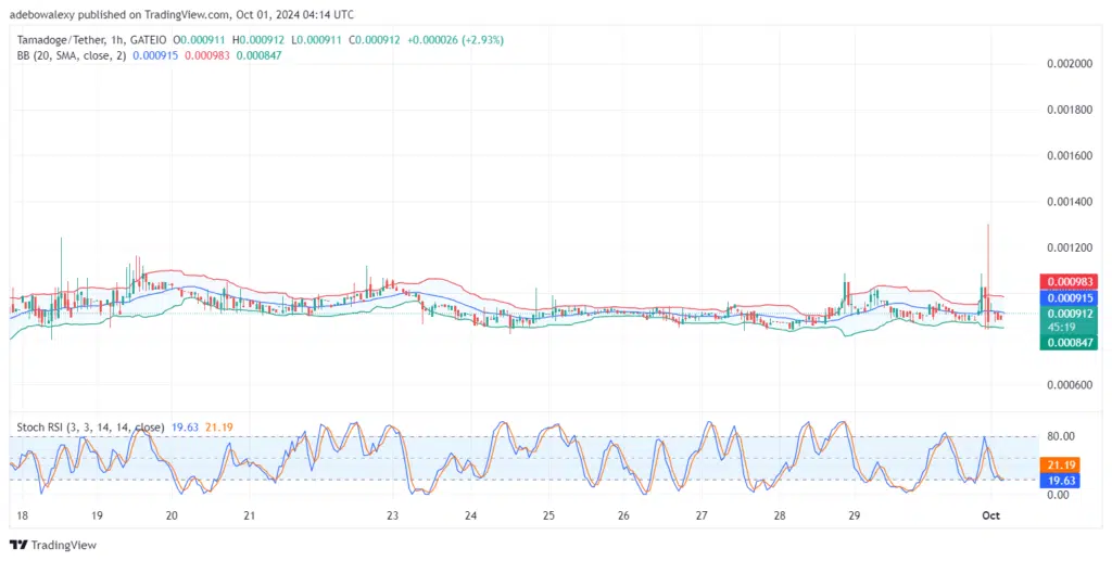 The last price candle on the Tamadoge 4-hour market is hugging the middle limit of the applied Bollinger Bands indicator. Meanwhile, the Stochastic Relative Strength Index (Stochastic RSI) lines are now in the oversold region.