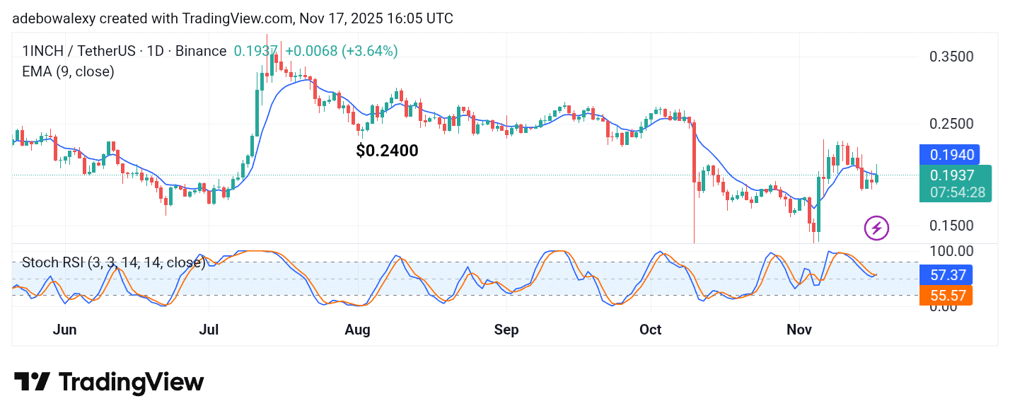 While the 1inch market continues to witness moderate bearish pressure, it can be observed that price action stands above a key technical level. The ongoing session is represented by a red price candle.
