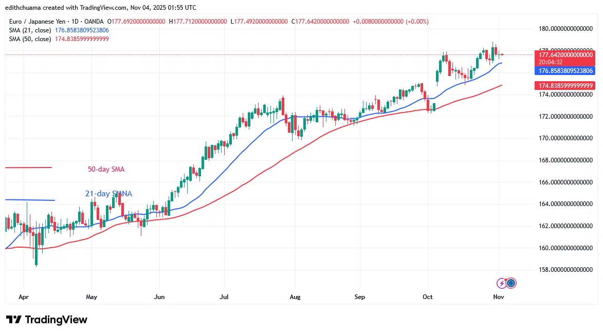 The EUR/JPY exchange rate has twice reached its peak, but dips below the 178.00 level barrier. On October 9, buyers drove the price to a high of $177.93, but the Yen declined and found support above the 21-day SMA. On October 30, the currency surged to a level of 178.82, but was halted at its recent high. The currency pair is slipping towards the 21-day SMA.