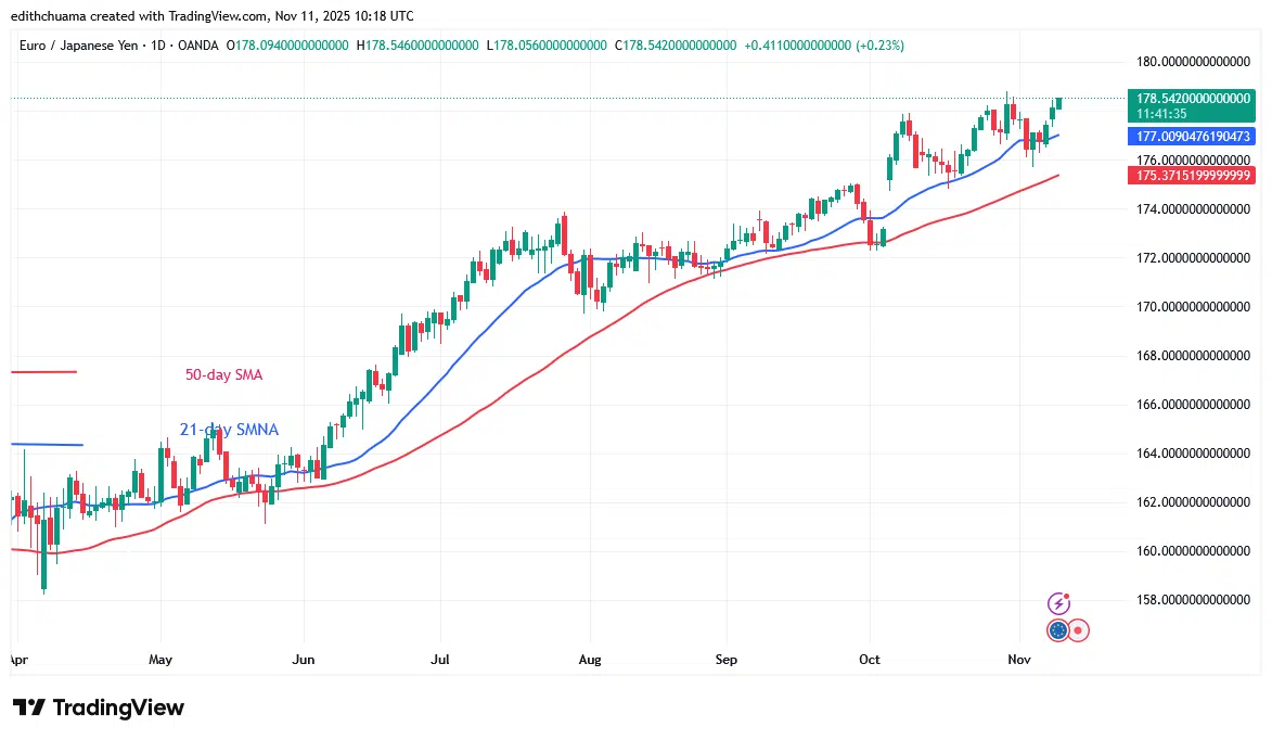 The EUR/JPY pair begins a bullish trend and closes above 178.00. Since October 8, the Yen has traded above the moving average lines but below the resistance level of 178. On November 10, buyers pushed the currency pair above 178.00. On the upside, if the bullish trend continues, the pair will achieve a high of 180.00.