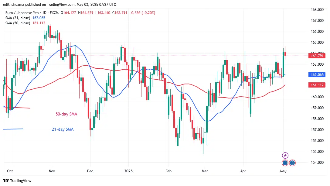 The EUR/JPY exchange rate has risen above the lines of the moving average but resumes its range below the level of 164.00. The currency pair oscillates below the resistance level at 164.00 but above the 21-day SMA support. Buyers have been unable to sustain the upward momentum above the 164.00 mark. The pair is presently retracing after hitting the resistance level at 164.00.