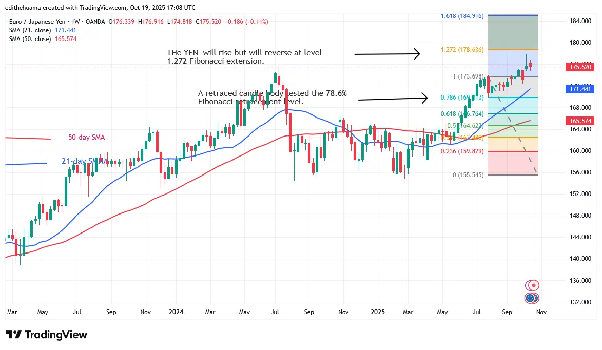The EUR/JPY pair recovers as it rises above 175.00 once more. On the 4-hour chart, the Yen is trading above the 175.00 support level and below the 178.00 resistance level. The currency pair has already declined and is still above 175.00. The forex signal is bullish, with price bars staying above the 21-day SMA support.