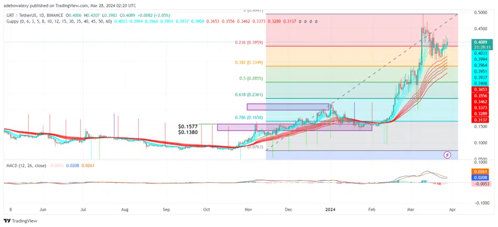The Graph daily market has revealed that traders have resumed gathering profits. This started after price action retreated below the green lines of the Guppy Multiple Moving Average (GMMA) lines. A sharp upside rebound occurred that sent the market back above the green GMMA lines. Afterward, the market has progressed upwards.