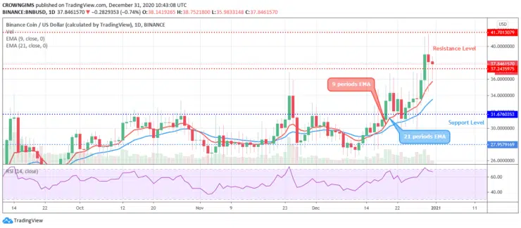BNBUSD is bullish on the long-term outlook. The coin broke out of the ranging zone on December 19. The bulls acquired more momentum and pushed up the coin to reach a high of $37 on December 20. The resistance at the just mentioned level prevented further increase in price and the price retraced to the $31 support level. The Bears could not maintain the pressure, the price bounced and the $37 level was penetrated and the price reached $41 level yesterday. The bearish momentum opened the market today with the possibility of decreasing further provided the support level at $37 does not hold.