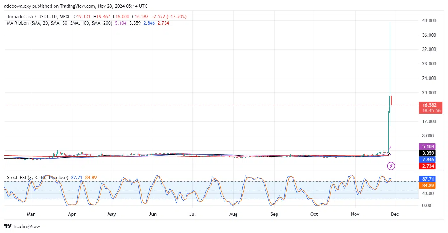Tornado Cash Downward Retracement Stays at Bay at $16 Mark
