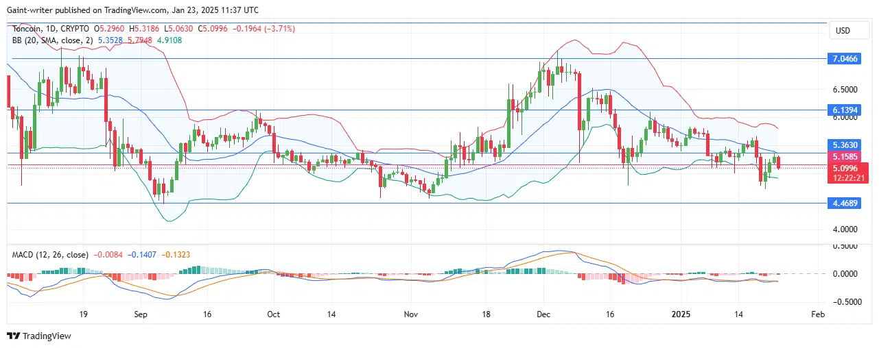 If sellers sustain their dominance, Toncoin could slip further, targeting $5.0000 as the next support level. A sustained bearish push below this level would confirm the downtrend, potentially leading to a decline toward $4.7000.