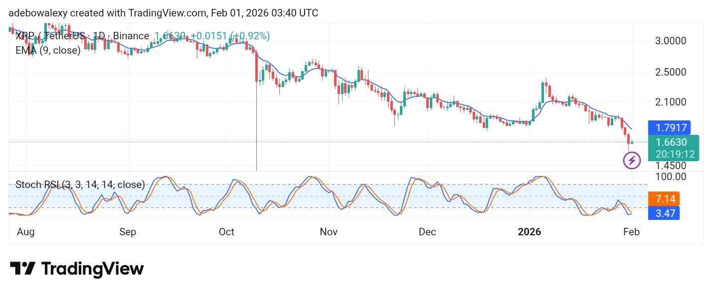 Despite the weak recovery attempt, the SRSI lines are converging toward a potential bullish crossover. Traders may wait for confirmation through a completed crossover and a break above the 9-day EMA before considering a bullish move toward the $2.15 level.