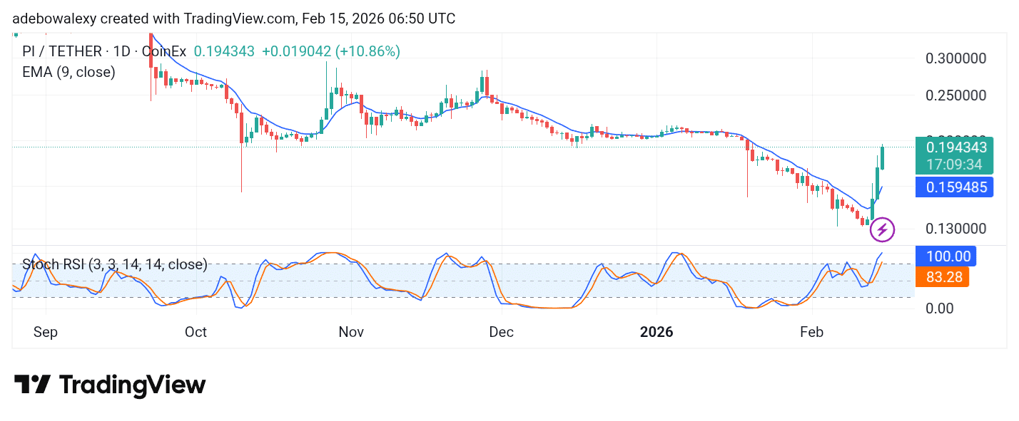 The PI daily market reveals that price action has been on an upward trend for the past three sessions. The latest candle reinforces this momentum, with trading continuing above the 9-day EMA. The SRSI indicator lines are also high in the overbought zone. This suggests that price action may be stretched, and the $0.200 level could serve as a near-term resistance.