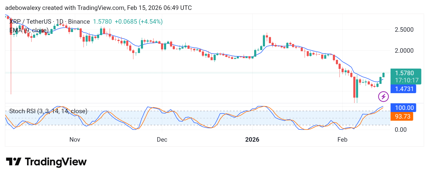 The price chart shows steady upward momentum, as reflected by the last three green price candles. However, the SRSI indicator lines are pushing upward from lower levels. This suggests that bullish momentum may be weakening slightly, and a pullback could occur around the $1.75 level. If that fails to hold, the $2.00 level may act as a strong resistance.
