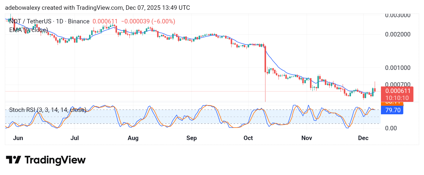 The ongoing daily session has seen some notable losses; however, the market is still trading above the 9-day EMA. The SRSI lines remain above the 70 threshold and are almost flat near the 80 mark. This suggests that bullish momentum may still propel the market toward the $0.000700 level.