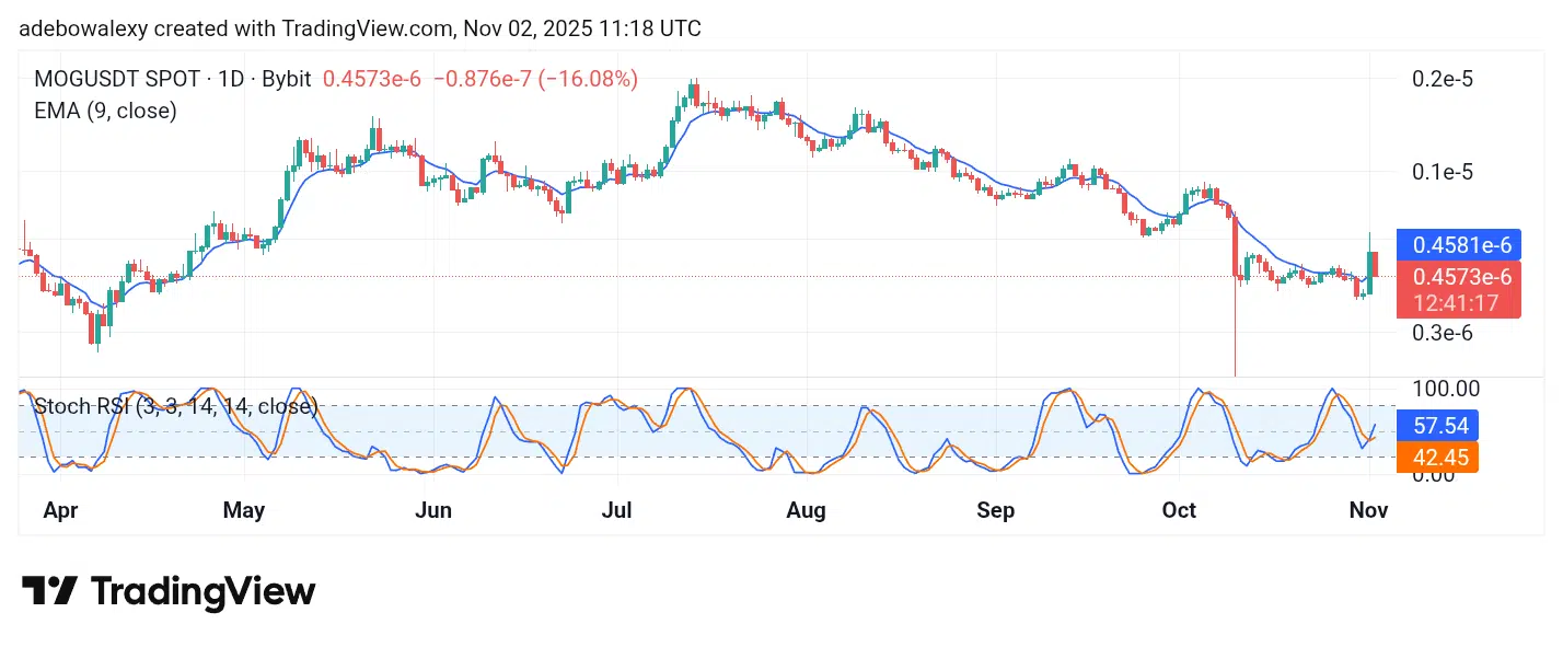 Although MOG remains the top trending coin, its price action suggests that it is facing resistance around a key technical baseline. The latest price candle is red, indicating that the token has retreated toward the 9-day Exponential Moving Average (EMA) line. The current price lies just below the 9-day EMA curve. However, the Stochastic Relative Strength Index (SRSI) indicator lines are projected upward from the oversold region. Since price action is still hovering around the 9-day EMA, the market may regain bullish traction and advance toward the $0.000001000 mark.