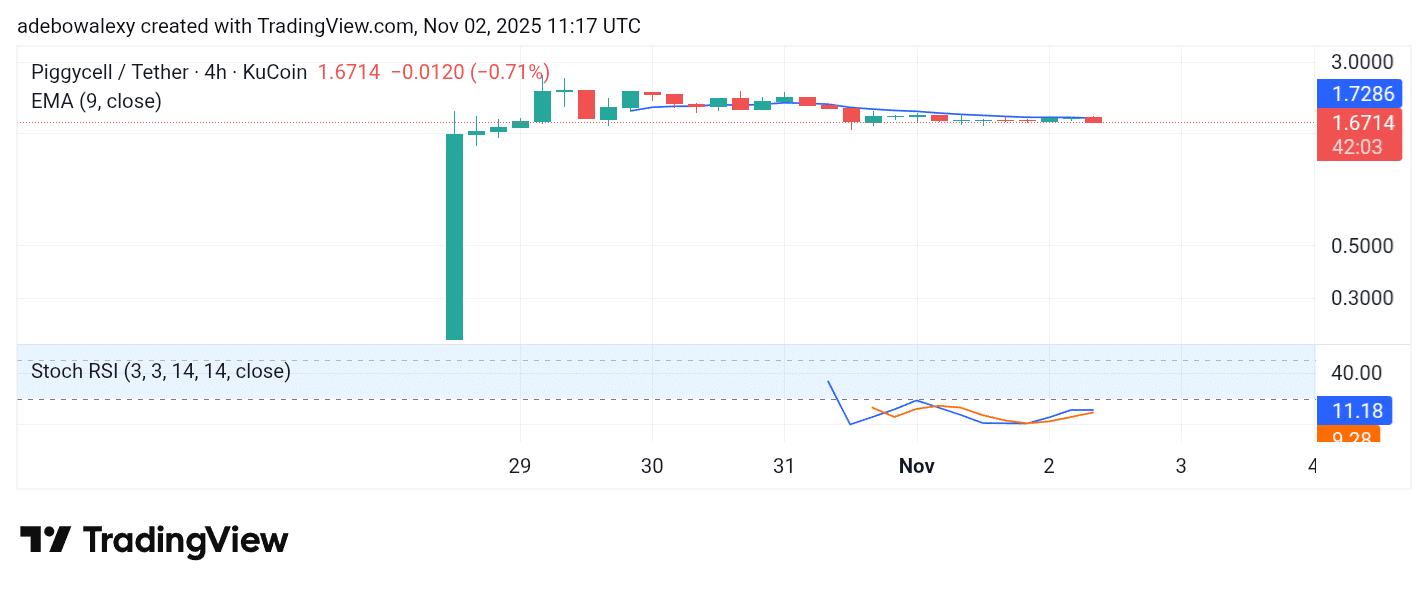 Piggycell appears to be in a consolidation phase. While price action has hovered around the 9-day EMA curve, the latest candle has retreated below this technical level. Nonetheless, the price still stands above its initial trading session close. As a recently launched token, PIGGY’s price activity is best observed on the hourly chart. The SRSI indicator lines are positioned in the oversold region but show a slight upward turn. This suggests that investor interest may still drive a short-term rebound toward the $2.50 level.