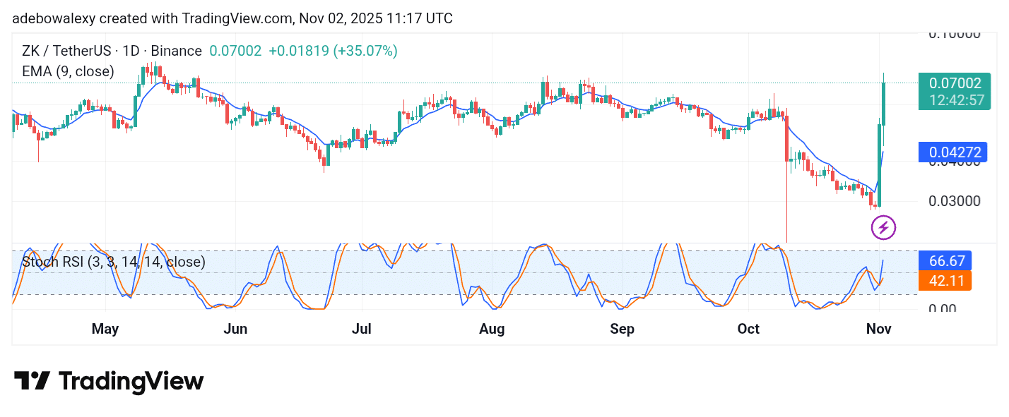 ZKsync has recorded massive gains within just two trading sessions on the daily chart, pushing its price to a level last seen about two months ago. The ongoing session shows the token trading well above the 9-day EMA curve, with the SRSI indicator lines rising steeply. The lead line has crossed above the 65 mark, while the lagging line remains near 42.11. Given the strong momentum and volatility, the market may soon approach the $0.08500 level.