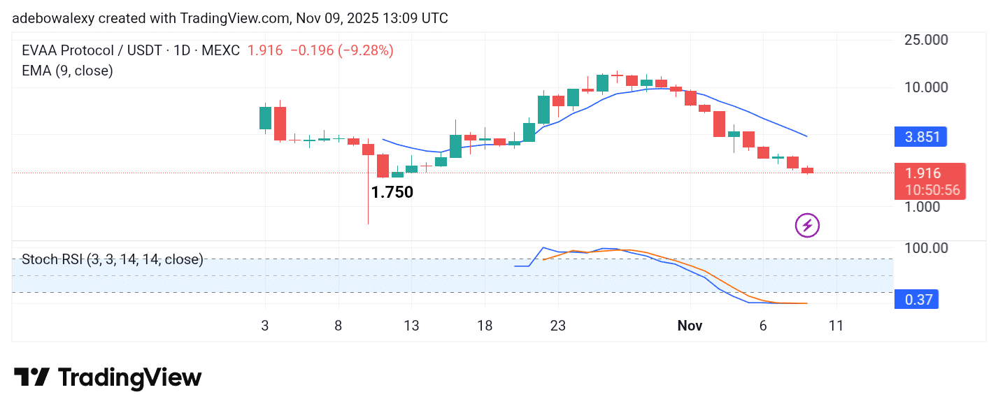 Despite being among this week’s trending coins, the EVAA token has recorded a price decline of 11.75%. It currently holds a market capitalization of $12.71 million with a trading volume of $324.42 million.