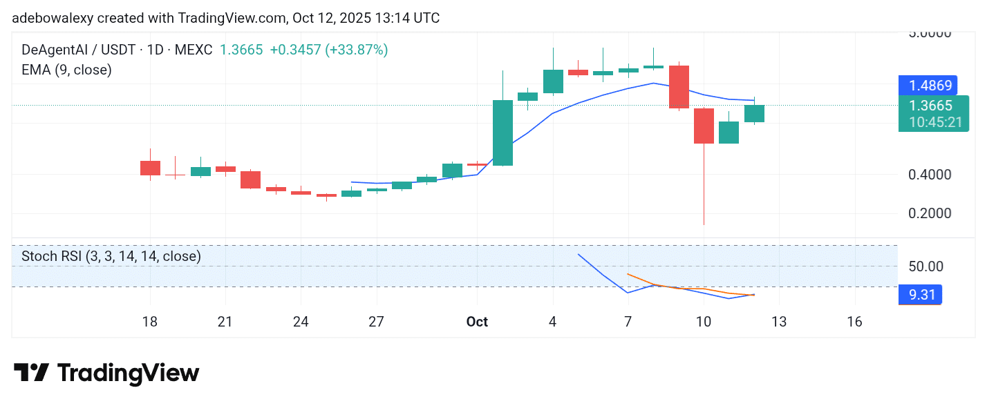The AIA token has been experiencing notable gains since the previous session, with the current session continuing the trend as prices rise toward the 9-day EMA curve. The SRSI indicator lines have also delivered an upward crossover in the oversold region, suggesting that price activity may still advance toward the $1.750 level.
