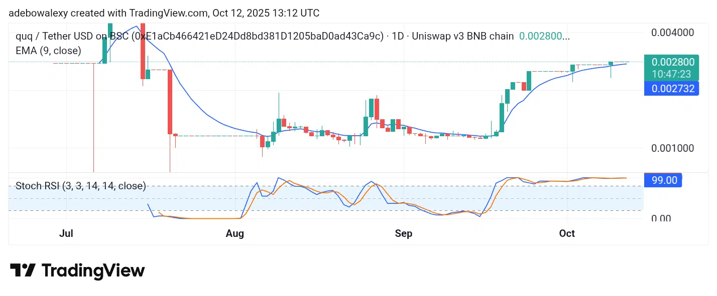 The QUQ/USDT market has been progressing upward in what seems like short bursts over the past week. Following a significant price increase three sessions ago, price action has since moved sideways. However, prices remain above the 9-day Exponential Moving Average (EMA) curve. The latest candle is a small green one, while the Stochastic Relative Strength Index (SRSI) lines continue sideways in the oversold region. Based on the current outlook, price action may push further toward the $0.003200 level.