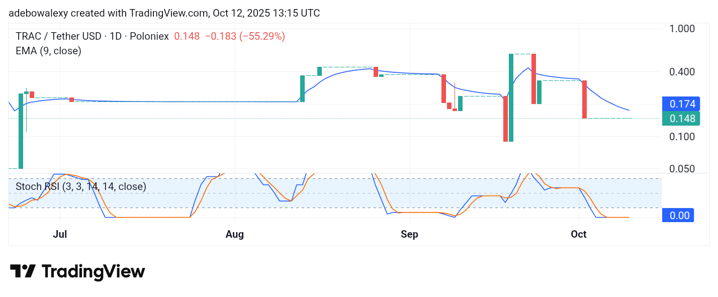The TRAC/USDT market has recently fallen below key technical indicators. Price action on the daily chart has dropped below the 9-day EMA curve, while the SRSI indicator lines are moving flat and sideways deep in the oversold region. The market remains suppressed below the EMA line and may continue downward toward the $0.100 level.