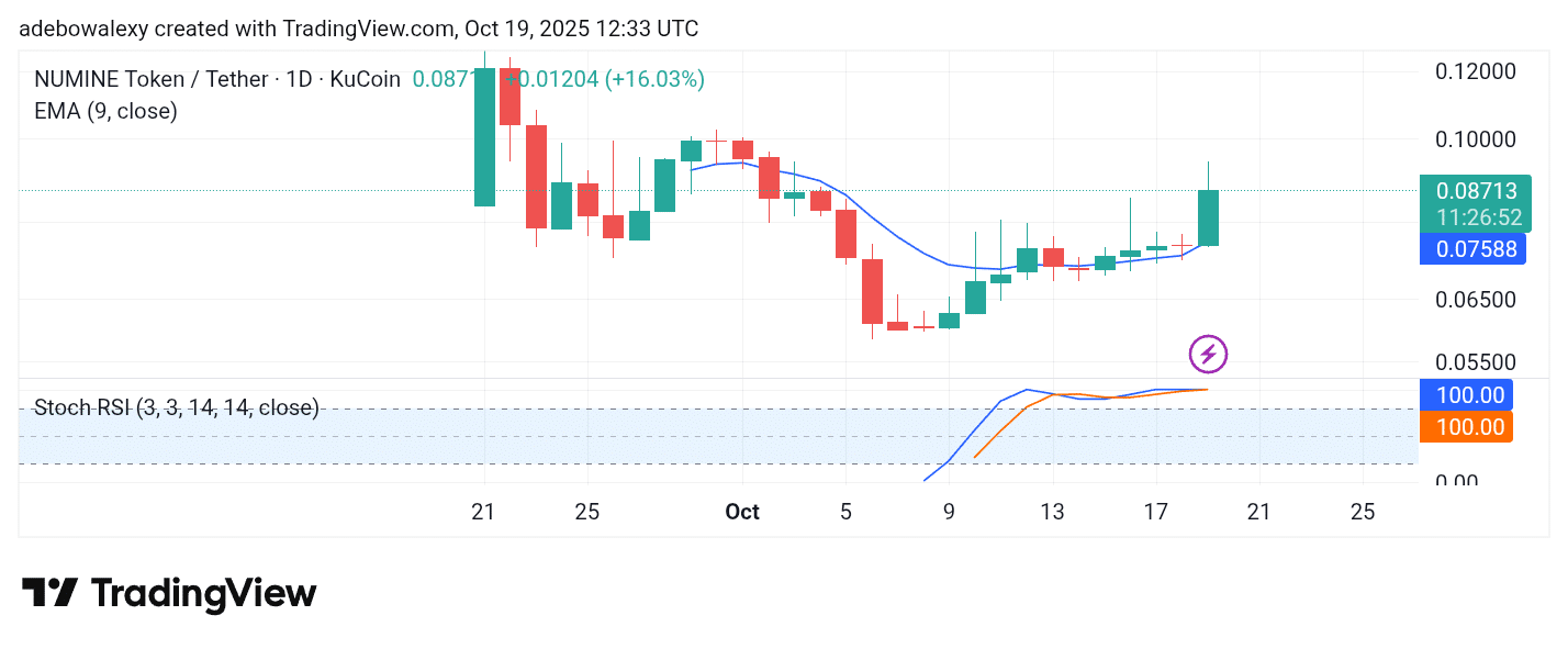 Current metrics show notable gains in the ongoing session. The latest price candle is a strong green one positioned above the 9-day EMA curve. Meanwhile, the SRSI lines are merged at the 100 level, moving sideways. This suggests strong bullish momentum, indicating that price activity may continue toward the $0.1000 mark.