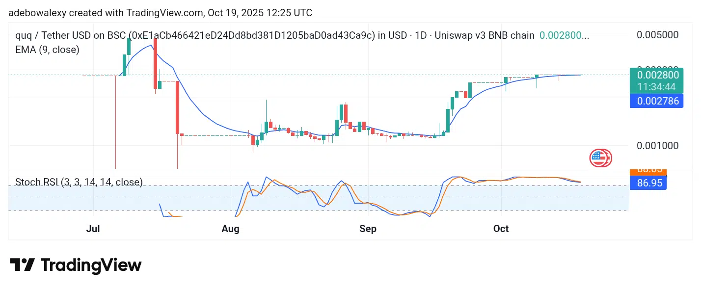 Price activity in the QUQ market has been consolidating for a while. However, this consolidation is occurring above the 9-day Exponential Moving Average (EMA). The most recent price candle shows a small green dash, keeping the token’s price at the $0.002800 level.
