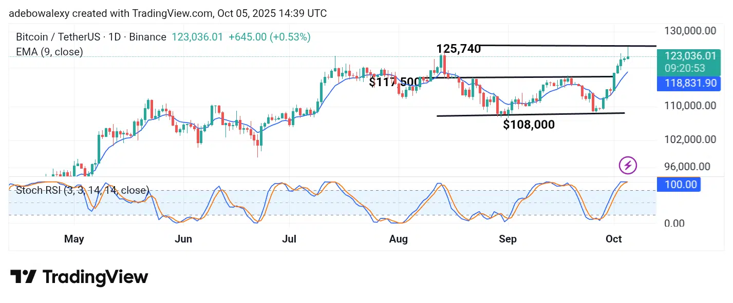 On the Bitcoin daily chart, price action can be seen rising sharply from support at the $108,000 level. The market has remained mostly bullish, pushing through the $117,000 resistance before testing $125,000. The current session remains bullish but shows slight downward contraction while staying above the 9-day Exponential Moving Average (EMA) line.