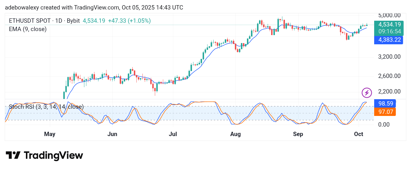 The Ethereum market has shown notable price movement recently, keeping the coin’s price above key technical levels such as the 9-day EMA curve. The current session remains bullish, reflecting strong market sentiment. Meanwhile, the SRSI lines are converged high in the overbought region but still angled upward, suggesting that upward momentum is likely to persist toward the $5,000 mark.