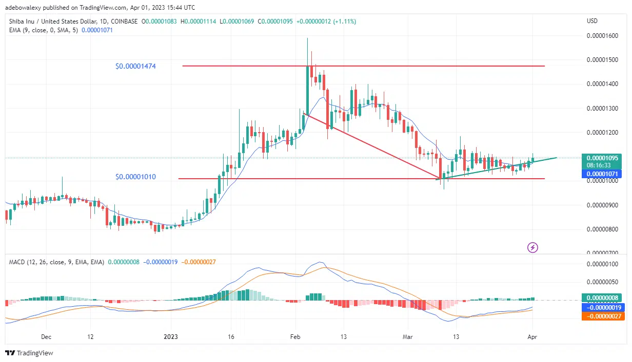 Shiba Inu comes in third on this week’s list with a market capitalization of $6,437,040,681, a trading volume of $216,220,507, and a market price of $0.00001092. Meanwhile, the price of this coin has increased by 2.06% in the last 24 hours and 2.73% in the past seven days. Consequently, this implies that the majority of the profit in this market was recorded today. Looking at the daily chart, it appears that the SHIB/USD market has remained consistent with minimal profits. However, this ongoing session is showing more upside characteristics, as price candles have now crossed above the 9-day EMA line. Additionally, the MACD indicator curve seems to have lately increased momentum towards the 0.00 mark. Similarly, the bars of the Moving Average Convergence Divergence indicator is now green to indicate a gain in bullish momentum. Therefore, price action seems ready to break the $0.00001100 mark and may rise further from there.
