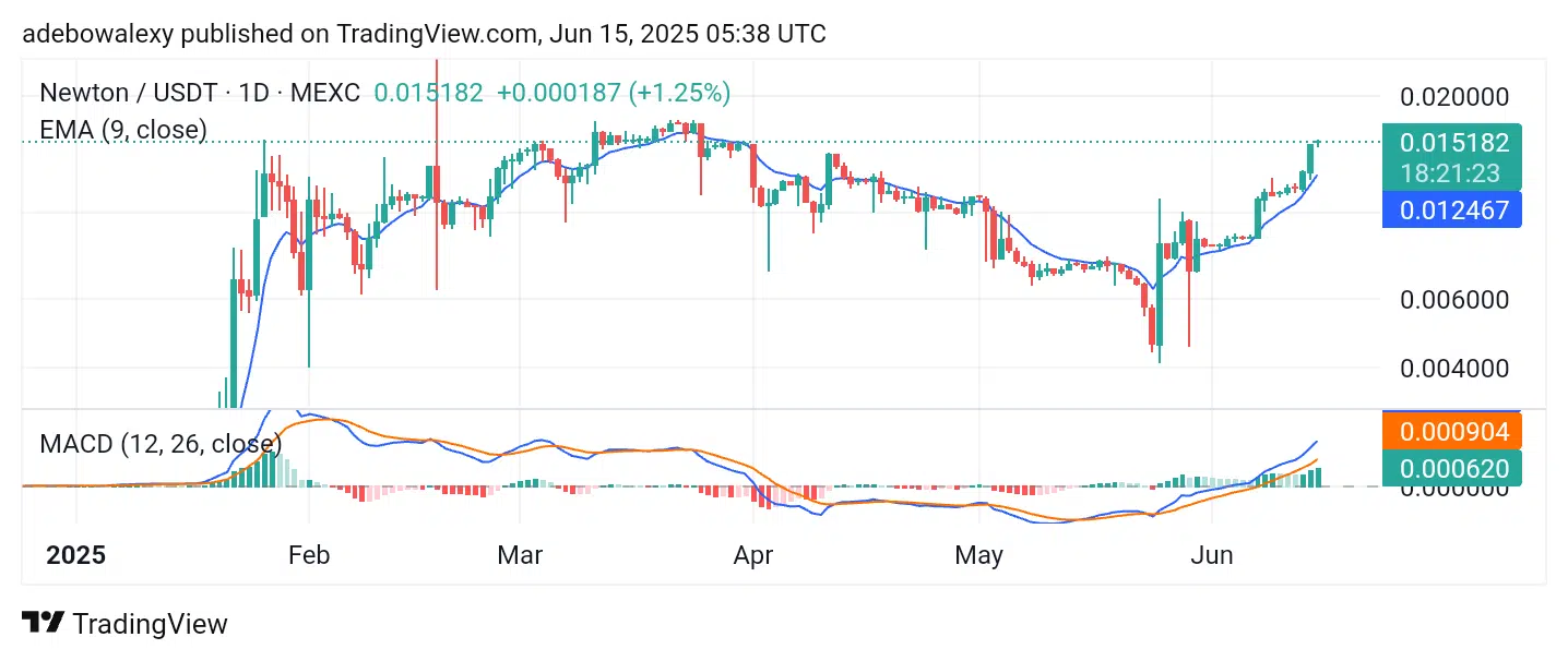 The MACD lines continue upward, and the green bars above the equilibrium level reinforce bullish momentum. As such, the token could be headed toward the $0.1500 level.