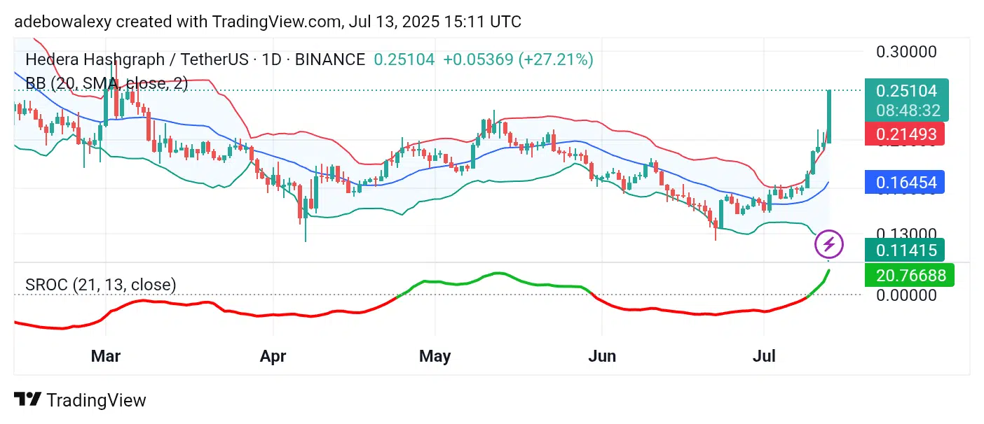 On the daily chart, price action has hovered near key technical levels in recent sessions. Today, however, has seen a breakout, with HBAR now trading above the upper limit of the Bollinger Bands (BB) indicator. The Smoothed Rate of Change (SROC) indicator also shows a sharp upward trajectory, signaling strong bullish momentum. Technically, the market appears to be aiming for a break of the psychological resistance at $0.3000.