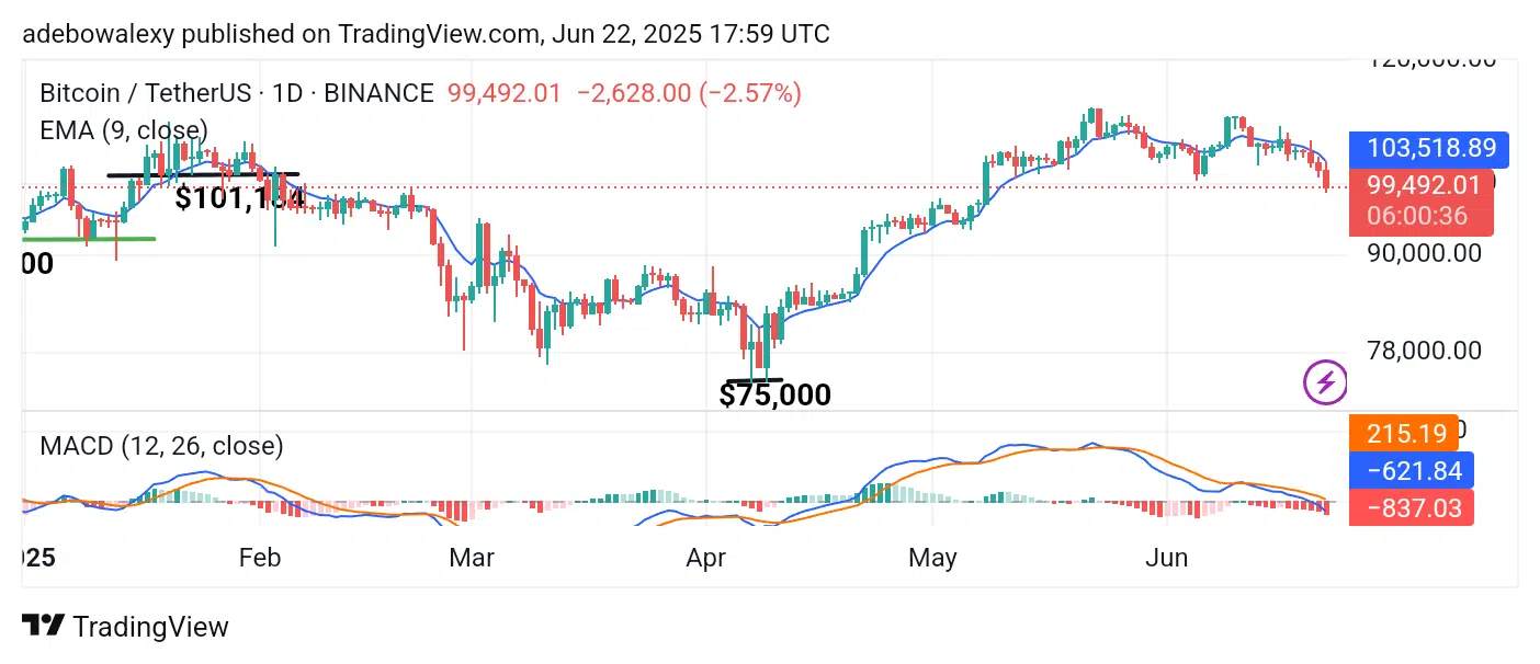 The token’s price chart shows a clear downward turn off resistance formed by the 9-day Exponential Moving Average (EMA) line. The latest price candle remains red, confirming a significant retracement. Additionally, the Moving Average Convergence Divergence (MACD) lines continue to fall, with the lead line now below the equilibrium level. Consequently, this market may extend its decline toward the $95,000 price level.