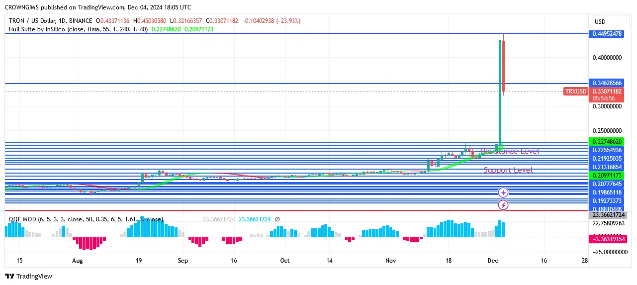 If the purchasing trend persists over $0.449, the price of TRON might be able to break through the $0.558 and $0.609 obstacles. If the price stays below $0.353, it can get close to the $0.228 and $0.219 levels.