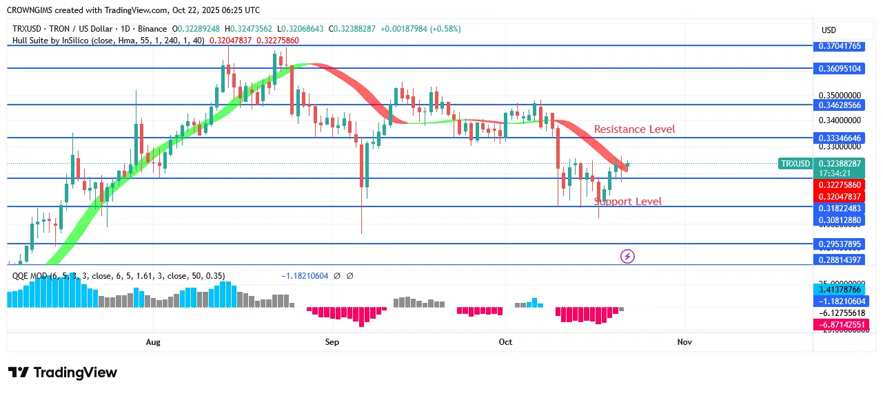 At the $0.30 resistance level, the bears lost steam. A profit is gain when the price of TRON flip above the Hull Suite forex signals indicator. The QQE MOD Crypto signaling indicator shows a positive trend since it is above zero. If the purchasing frenzy continues over $0.33, the price of TRON might be ready to break through the $0.34 and $0.36 barriers. If the price stays below $0.32, it might become closer to the $0.31 and $0.30 scripts.