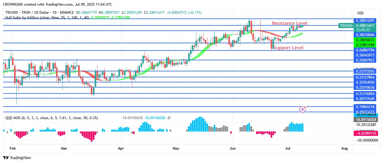 If the buying trend continues over $0.29, the price of TRON might be poised to break through the $0.30 and $0.31 barriers. If the price stays below $0.28, it can approach the $0.26 and $0.25 scripts.