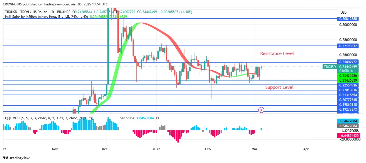 The price of TRON may be ready to overcome the $0.30 and $0.34 barriers if the buying trend continues above $0.25. The price may become closer to the $0.21 and $0.20 scripts if it remains below $0.22.